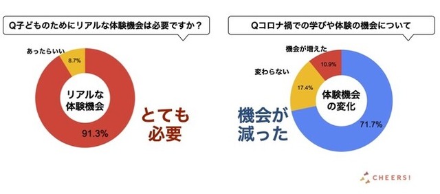「こどもたちに、100の出会いと体験を」を合言葉に、小学生向けキャリア教育を展開する、CHEERS株式会社(本社:東京都渋谷区、代表取締役:白井 智子)は、7-9月に小学生親子1000名を対象に夏休みイベントを開催。体験と学びに関する実態調査を行いました。近年、コロナ禍でリアルな体験の場は減少した一方で、教育のデジタル化が加速し学びの場の変革が起きる中で、こどもの学びをどのように考えているかを聴取。調査結果からは、こどもにはリアルな体験をさせたいが、コロナ禍によってその機会をなかなか作れていないという保護者の葛藤が見えてきました。