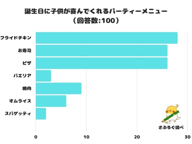 誕生日に子供が喜んでくれるパーティーメニューをアンケートにて調査したところ、1位は「フライドチキン」でした。