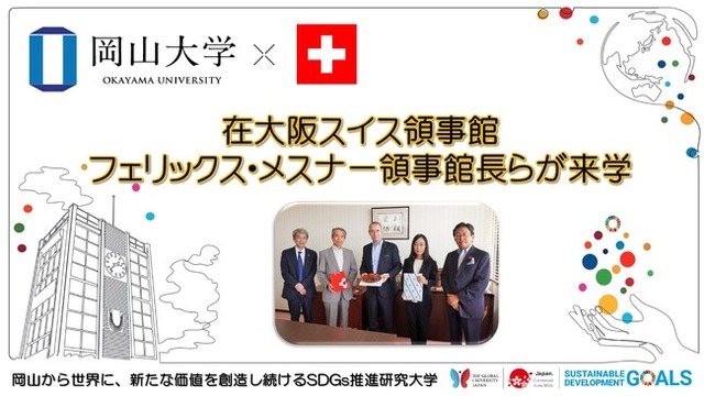 在大阪スイス領事館のフェリックス・メスナー領事館長らが2022年9月9日、本学(岡山市北区)を訪れ、槇野博史学長を表敬訪問しました。本学からは槇野学長のほか、那須保友理事(研究担当)・副学長、鈴木孝義副学長(国際担当)が出席しました。