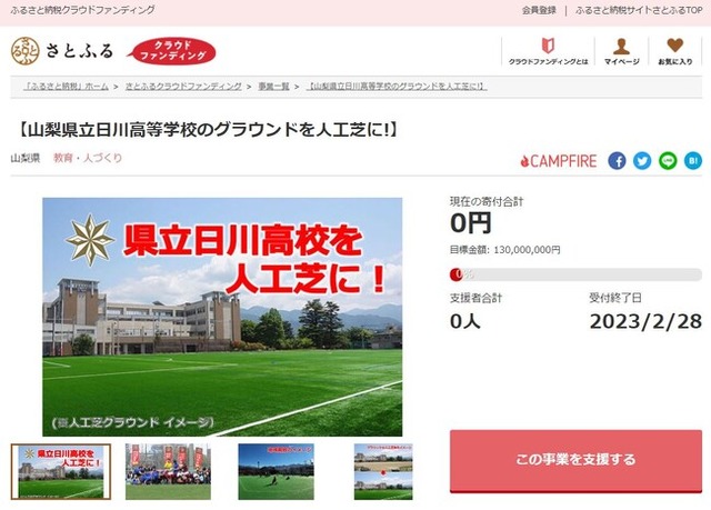 山梨県とふるさと納税ポータルサイト「さとふる」(https://www.satofull.jp/)を運営する株式会社さとふる(本社:東京都中央区、代表取締役社長:藤井 宏明)は、寄付金の使途に応じて事業を立ち上げ寄付を募る「さとふるクラウドファンディング」(https://www.satofull.jp/projects/top.php)にて、山梨県立日川高等学校の魅力向上と地域全体の活性化を目指して、日川高等学校のグラウンドを人工芝生にするため、2022年9月22日より寄付受け付けを開始します。