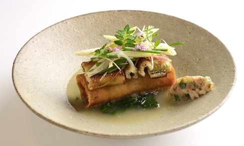 カルローズをアナゴの骨でとった出汁で茹でて揚げ春巻きにし、出汁と合わせてお茶漬け風にも楽しめる一品。