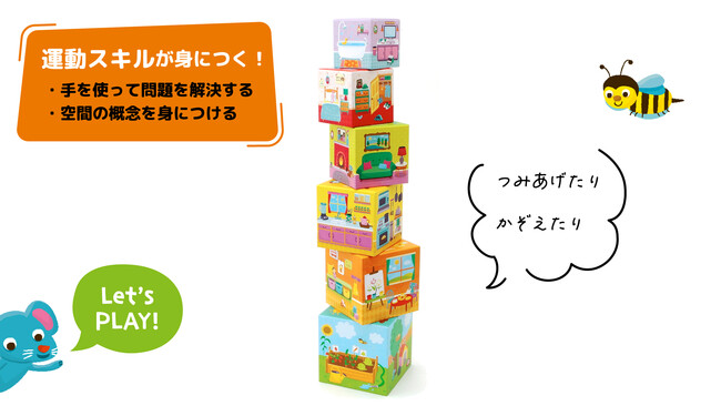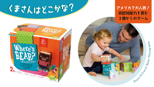 アメリカで大人気の知育玩具が上陸! 世界的なおもちゃ賞として有名なオッペンハイム・トイ・アワードで「プラチナトイアワード」を受賞した玩具です。6つのブロックとくまの人形を使って、積み重ねたり、くまさん探しをしたり、お話を作ったり…親子で仲良く会話しながら繰り返し遊ぶことで、昨今、豊かな人間形成に欠かせないといわれる「非認知能力」を育むことにつながります。