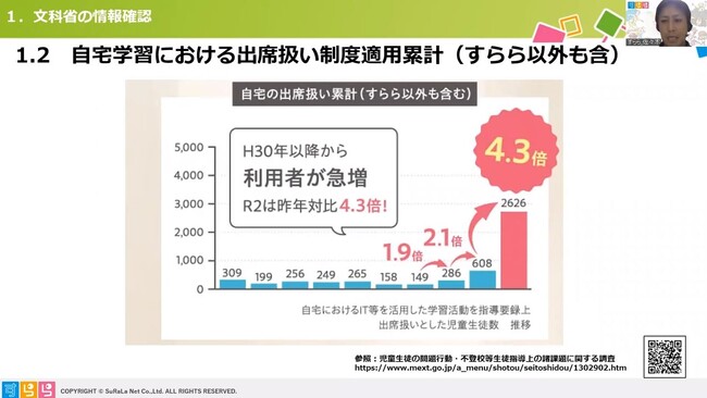 セミナーでは、子どもの発達支援室長佐々木から、不登校生徒の出席扱いについて紹介しました。文部科学省が公表している「不登校児童生徒が自宅において ICT 等を活用した学習活動を行った場合の指導揚力上の出欠の取扱いについて」通達の説明や、出席扱いを認められた児童生徒数の推移、出席扱いになる7つの要点、具体的なアクションや流れについて説明し、事前に寄せられた質問への回答を行いました。令和 2 年度文部科学省調査によると、全国に 196,127 人いる不登校児童・生徒のうち、出席扱いを認められた児童・生徒は年間 2,626人であり、昨年対比 4.3 倍ではあるものの、出席扱いの制度は認知も活用も依然高いとは言えません。