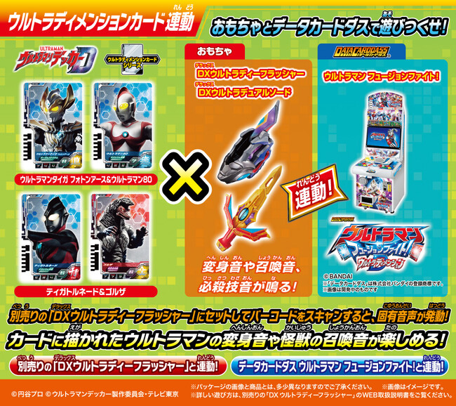 なお対象のアパレルアイテムには、変身アイテム「DXウルトラディーフラッシャー」(別売り)と「データカードダス ウルトラマン フュージョンファイト!」と連動するアイテム「ウルトラディメンションカード」が各アイテムにつき2枚付属しております。