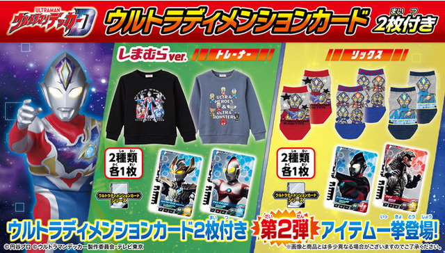 株式会社バンダイ ファッションブランド事業部では、株式会社しまむら(本社:埼玉県さいたま市、代表取締役:鈴木 誠、以下 しまむら)とのコラボレーションとして、テレビ東京系にて放映中の『ウルトラマンデッカー』の変身アイテム「DXウルトラディーフラッシャー」(別売り)と連動する「ウルトラディメンションカード」が2枚付属するトレーナーやソックスのアパレルアイテム全2種を2022年9月23日(金)に全国のしまむら店舗と、しまむら公式オンラインストアにて発売いたします。