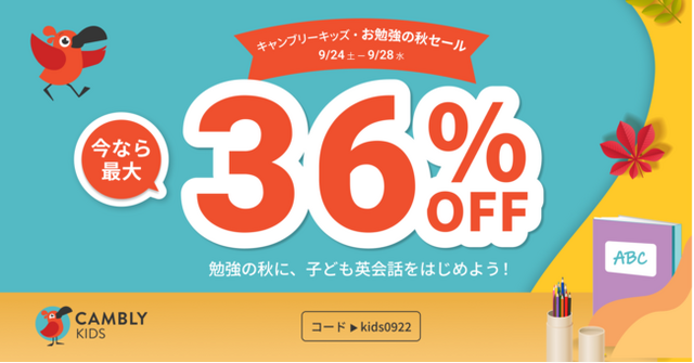 Cambly Inc.(本社:アメリカ・サンフランシスコ、日本代表:佐藤 亜希子)が提供する子ども向けオンライン英会話サービス「Cambly Kids(キャンブリー キッズ)」は、9月24日(土)から9月28日(水)までの5日間、Cambly Kids全レッスンプランを最大36%OFFでご利用いただけるセールを開催いたします。
