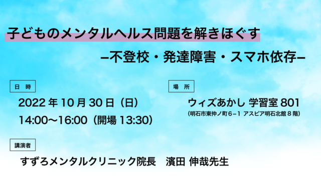 兵庫県内で子ども支援を行う特定非営利活動法人兵庫子ども支援団体(所在地:兵庫県明石市、代表理事:多田実乘、以下「当法人」という)は、10月30日(日)に兵庫県明石市で「子どものメンタルヘルス」についての講演会を開催いたします。開催に先立ち、本日9月26日より申し込みの受付を開始いたしましたので、合わせてお知らせいたします。