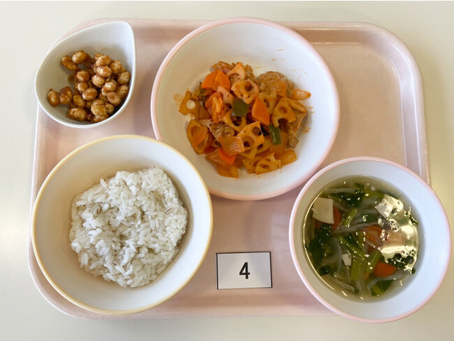 煎り大豆やれんこん、きくらげなど歯ごたえのある食材を使い、噛む力を促す「かみかみ献立」を意識しました。また、切り干し大根などの乾物は、「給食ではじめて食べた」という声を児童から聞くことがあるため、色々な食材があることを知ってほしいと願い、献立に取り入れました。ピーマンや小松菜、ミニトマトなどの地場産の野菜を多く使用したことも、栄養面や彩りを豊かにするポイントです。