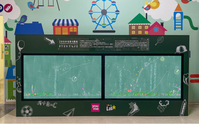 《こびとが住まう黒板》の中には、ゆめタウンのキャラクター「ユーくん&メーちゃん」がこびとと一緒に住んでいます。黒板の中のこびとやユーくん、メーちゃん、シャボン玉などにタッチしたり、線を引いたりすると、インタラクティブに世界が変化していきます。