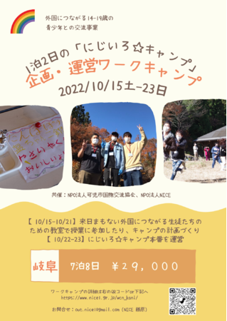 NPO法人NICE(全国事務局:神奈川県横浜市戸塚)は、NPO法人可児市国際交流協会(岐阜県可児市)と共催で開催する、外国につながる子どもたちとのワークキャンプ「にじいろ☆キャンプ」の参加者を募集します。