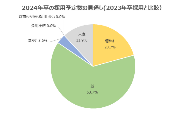 2024年卒の採用予定数について、「増やす」と回答した企業が20.7%で、「減らす」と回答した企業の5.7倍となりました。最も回答を集めたのは、「並(2023年卒採用並)」63.7%でした。