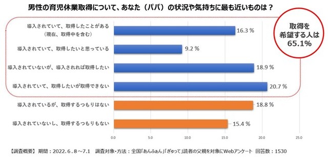 男性の育児休業取得意向について、「あんふぁん」「ぎゅって」読者の父親に聞いたところ、取得を希望する人は65.1%に上りました(職場への導入の有無を問わず)。その理由として、産後の大変な時期に妻に対してできることをしたい、生まれたばかりの子どもとの時間を一緒に過ごしたいという声が多く見られました。
