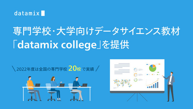 株式会社データミックス(本社:東京都千代田区、代表取締役:堅田 洋資、以下 データミックス)は、大学生・専門学校のデータサイエンス教育の指導者不足の解消を目指し、大学・専門学校に向けたデータサイエンス教材セット「datamix college(データミックスカレッジ)」の配布を2022年4月より開始。2022年9月現在、14校の専門学校で導入されたのでお知らせいたします。