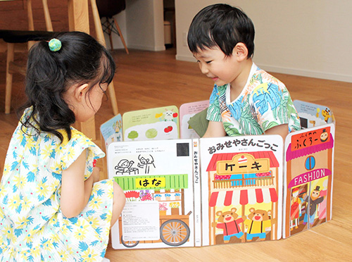 絵本の中に入り「いらっしゃいませ~」と、好きなお店の店員さんになりきって遊んでみよう!