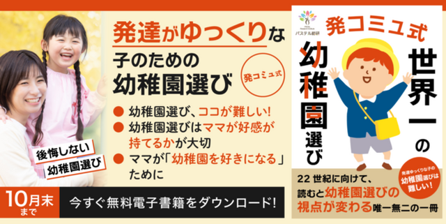 この小冊子では、そんな発達障害グレーゾーンのママたちの不安を解説し、新しい視点での解決策を提案しています。特に、幼稚園選びが劇的にスムーズになる新しい視点に注目していただき、幼稚園選びを楽しい時間にかえるべく参考にしていただければと思います。