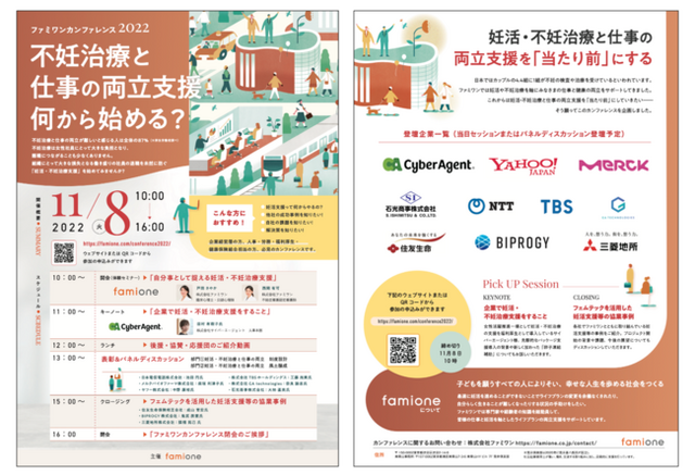 ファミワンとして初のカンファレンスとなる今年は、「不妊治療と仕事の両立支援、何から始める?」をテーマに、基調講演などを行います。キーノートには卵子凍結支援の発表もあったサイバーエージェントの田村さまをお呼びし、企業で妊活・不妊治療の支援を行うことについて講演いただきます。
