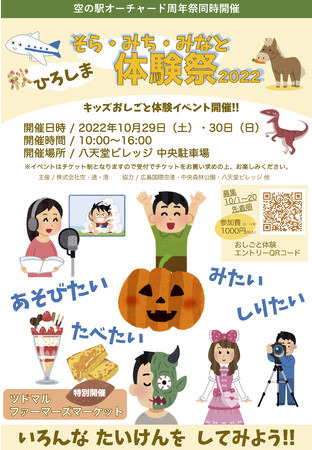 広島県の三原・世羅地域の資源を活かした観光地域づくり法人(DMO)「株式会社空・道・港」では、このたび広島空港に隣接する八天堂ビレッジを会場として家族でお楽しみいただける「そらみちみなと体験祭2022」を開催いたします。その中でキッズおしごと体験イベントも実施いたします。お子様のおしごと体験以外にも「遊びたい」「観たい」「食べたい」「知りたい」をテーマでの体験するイベントが盛りだくさんです。