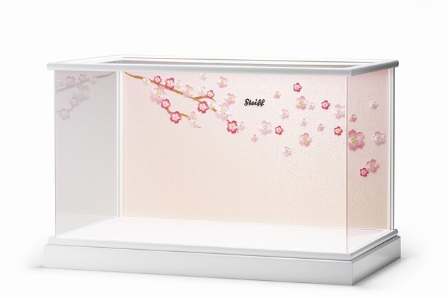 シュタイフのひな人形専用のアクリルケースをご用意しました。背面の薄ピンク色の下地と桜刺繍が、雛人形をより華やかに飾ります。