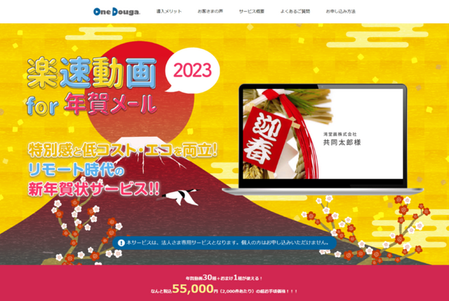 共同印刷株式会社(本社:東京都文京区、代表取締役社長:藤森康彰)は、OneDougaを活用した法人専用年賀動画サービスの販売を10月3日から開始しました。パーソナライズした年賀動画をブラウザ上での操作で簡単に生成でき、Eメール配信などでペーパーレス化できます。低コスト・エコロジーでありながら、大切な相手へ気持ちを届けるという年賀状本来の役割はしっかり果たす、リモート時代の新年賀状サービスを提供します。