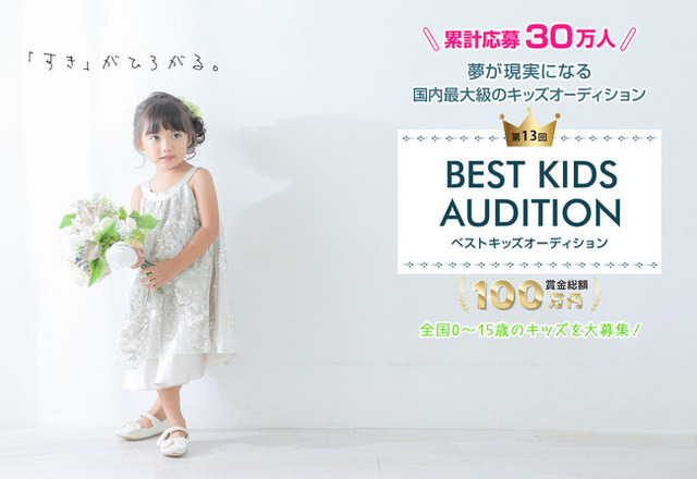 「ベストキッズオーディション」は、大手芸能プロダクション、フォトスタジオやアパレルブランド、全国の百貨店などとタイアップし展開する国内最大級のキッズオーディションです。
