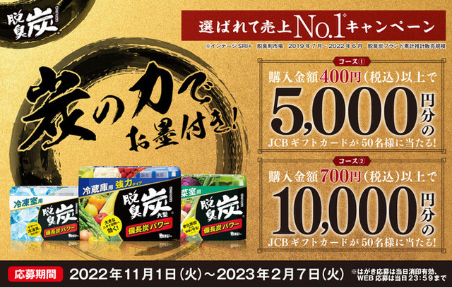 本キャンペーンは「脱臭炭」ブランド全品の中から税込み400円以上の購入でJCBギフトカード5,000円分を、また税込み700円以上の購入でJCBギフトカード10,000円分をそれぞれ抽選で50名様、合計100名様にプレゼントします。