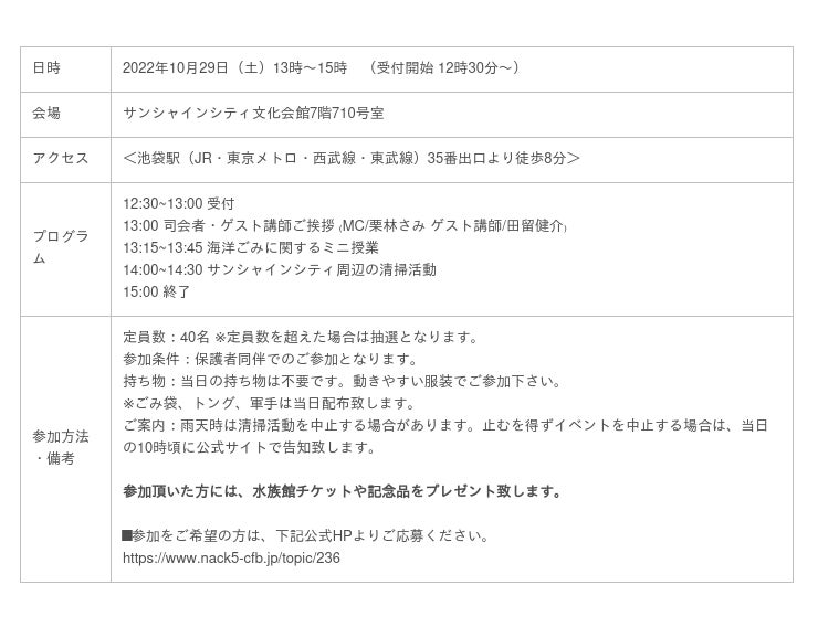 make the future実行委員会は、10月29日(土)にサンシャイン水族館とコラボレーションした小学生向けの海洋ごみ授業とサンシャインシティ周辺の清掃活動を開催いたします。このイベントは、日本財団が推進する海洋ごみ対策プロジェクト「海と日本プロジェクト・CHANGE FOR THE BLUE」の一環で開催するものです。