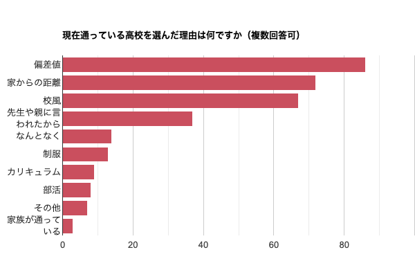 現在通っている高校を選んだ理由に関する調査では、回答数が最も多かったのは「学校の偏差値」で、次に「家からの距離」と「校風」の回答でした。偏差値と通学時間から学校の候補を選び、校風で決定する方法が多いと考えられます。