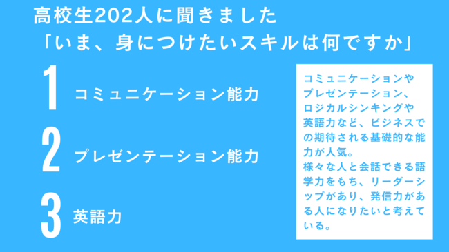 高校生活のなかで身につけたいスキルについての質問では、約40%の高校生は、コミュニケーション能力を上げております。その他、プレゼンテーション力、英語力など、将来の仕事に繋がるスキルを学びたいと考える傾向があります。