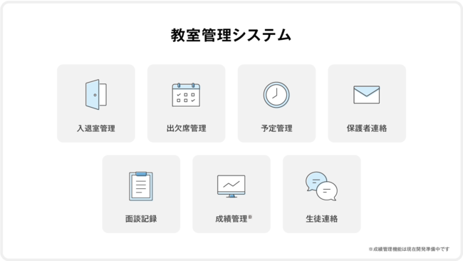 今まで有償提供していた「教室管理システム」を無償提供します。生徒の入室、出席、予定、成績などの管理や、保護者・生徒との連絡など、多岐にわたる業務をデジタル化できます。