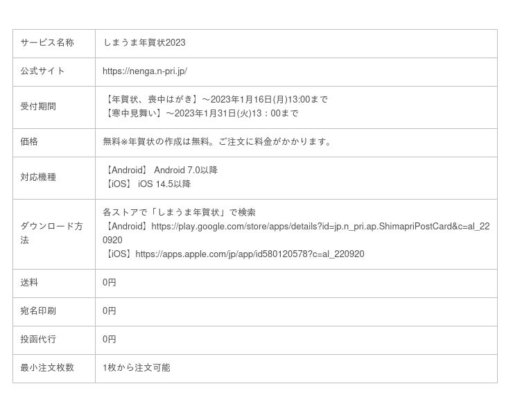 コスパNo.1・高品質No.1・簡単操作No.1※に選ばれたネットプリントサービスを提供する株式会社しまうまプリント(本社:東京都新宿区、代表取締役社長:高橋 洋一郎、以下「しまうまプリント」)は、PC/Android/iPhoneから簡単に年賀状印刷の注文ができる「しまうま年賀状2023」年賀状プリントサービスの受付を2022年10月3日(月)より開始したことをお知らせいたします。