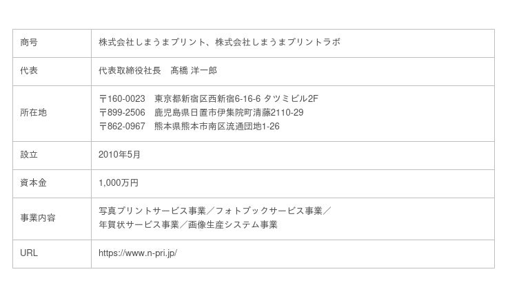 しまうまプリントはネットプリント専業で累計会員数430万人超の「しまうまプリント(https://www.n-pri.jp/)」サービスを運営。写真プリント・フォトブック・年賀状など「思い出」を通じて暮らしに笑顔をお届けする企業です。鹿児島県に設立の「国内最大級のラボ」では独自のオペレーションシステムを活用。また、写真業界経験20年以上の技術者がプリントしているため、業界最安級の低価格で高品質の商品をスピード出荷にてお届けしています。