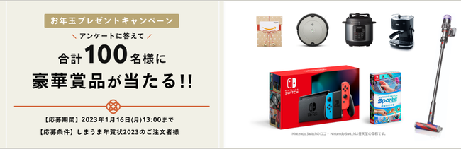 Nintendo Switchやダイソン掃除機、Amazonギフト券(5,000円分)などの豪華賞品が合計100名様に当たるお年玉プレゼントキャンペーンを実施中です。キャンペーン期間中、「しまうま年賀状2023」で年賀状・喪中はがき・寒中見舞いのいずれかを注文してご応募いただいた方の中から抽選でプレゼントいたします。