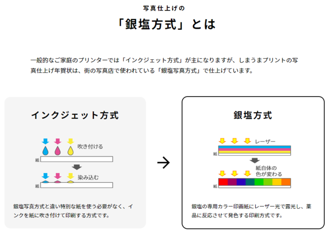 写真プリントやフォトブック、アルバムなど様々な写真関連サービスを提供してきたネットプリント専門店・しまうまプリントの年賀状は、2タイプの仕上げをご用意しております。「写真仕上げ」では、写真屋さんと同じ銀塩技術を採用しており、富士フイルムの純正印画紙で写真本来の鮮やかで高画質な仕上がりになります。「印刷仕上げ」では、文字を鮮明に印刷することができ、自社工場ならではの高品質と低価格を実現。家族や友人へ想いを込めてつくる年賀状。気になるクオリティをぜひ、お試し印刷でお確かめください。
