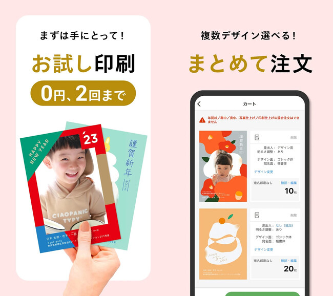 「しまうま年賀状2023」では、年賀状デザインに追加料金なしで同時に注文できるようになりました!昨年までは1デザイン注文するごとに基本料金がかかっていたところ、今年は同時に10デザインまでまとめてご注文いただけるので、デザイン選びが楽しくなること、家計にやさしく賢くお得になること間違いなし!離れて暮らす家族にはお子様の写真を添えて、職場でお世話になっている方にはおしゃれなデザインなど、送る相手にあわせて1回のご注文でお届けできます。