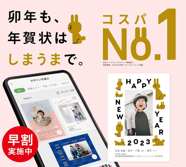 受付開始を記念し、本日より「早割キャンペーン」を実施いたします。キャンペーン期間中にご注文された方は、年賀状プリント料金が最大58%OFFとなりますので、よりお得に年賀状印刷を注文できます(詳しくは随時公式サイトをご確認ください)。※日本マーケティングリサーチ機構調べ、調査概要:2021年7月期 ブランドのイメージ調査