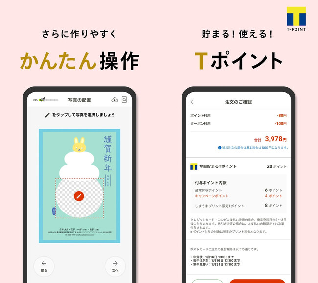 しまうまプリントでは、写真プリント・フォトブック・年賀状・アルバムをご注文いただくと、Tポイントが貯まります。また、ご注文時にもTポイントがご利用いただけます。