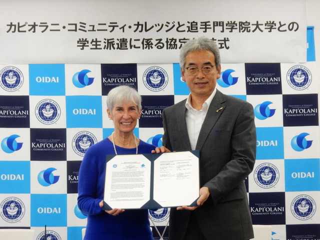 追手門学院大学(略称:追大、大阪府茨木市、学長:真銅正宏)は、ハワイ大学カピオラニ・コミュニティ・カレッジ (ハワイ州ホノルル、学長:ルイーズ・パゴット、以下KCC)と派遣留学およびダブルディグリープログラム開設に関する連携協定を2022年9月29日に締結し、国際学部の学生を対象にしたダブルディグリープログラムを2023年にも開始します。
