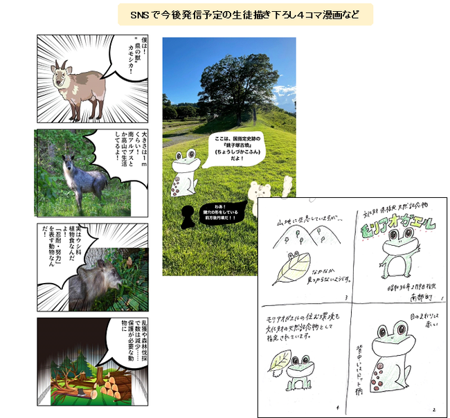 また「桃チーム」では、「堅苦しく考えがちな文化財を楽しんでもらえるハードルを下げたい」という想いから、チームメンバーで描き下ろした4コマ漫画を用いて、実際に過去に自分たちが体験したストーリーや文化財の面白いエピソードや歴史を全20話のストーリーとしました。テーマは「コミック山梨」。文化財の魅力を面白く楽しい漫画にして伝えるという想いが込められています。誰もが文化財に親しみをもってもらえるような工夫を凝らしながら、「富士山チーム」と同じFacebook、Twitter、Instagramの同一SNS公式アカウントを用いて、10月上旬から2月中旬にかけて発信予定です。