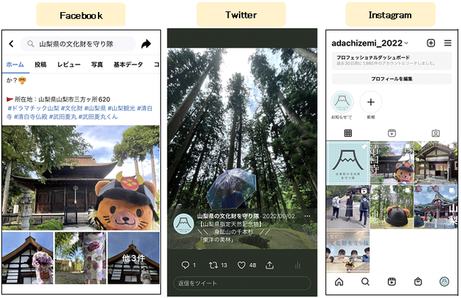 まず「富士山チーム」では、国指定の天然記念動物である「甲斐犬」がモチーフとなった本県の観光キャラバン隊長を務める「武田菱丸」を主人公に見立て、通期テーマを「ドラマチック山梨」と命名しました。さらに7月から3月までの発信時期を3期に分け、それぞれの期間で設定したテーマに即した県内の文化財に焦点を当て、Facebook、Twitter、Instagramに設けた公式アカウントにて、それぞれの媒体特性に応じた内容にて順次発信を行っています。