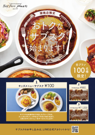 この度、ベビーフェイスプラネッツ湖南店では、お子様向けサブスク「キッズメニューサブスク」の提供を10月7日(金)19時より開始いたします。