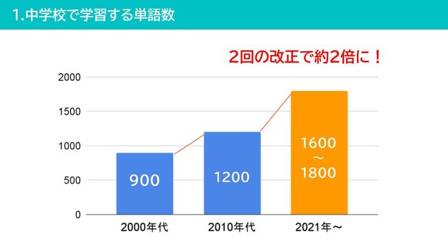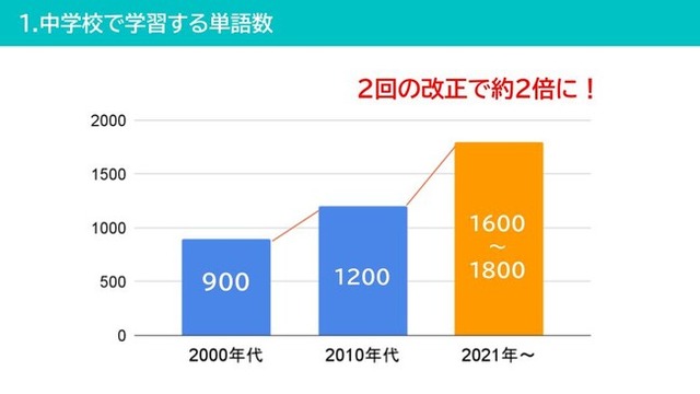 また、中学校で覚える英単語が1200語から400語増え、1600~1800語になりました。
