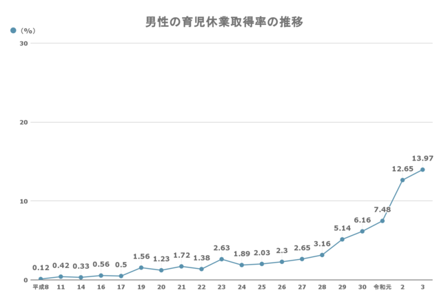 政府は、今回の「産後パパ育休」の施行などで男性の育休取得を促進し、2025年までに男性の育児休業取得率を30%まで上げることを目標として掲げています。しかし厚生労働省によると、男性の育児休業取得率は令和3年度で13.97%であり、全体の2割にも達していない結果となっています。