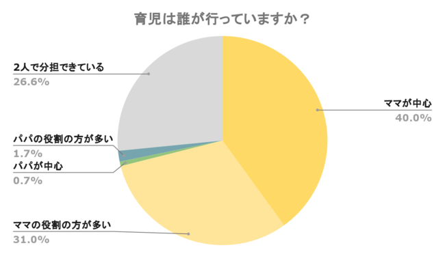 BABY JOBが保育園に子どもを通わせている全国の保護者2,875名を対象に行った調査では、「育児は誰が行っているか」という質問に対して「ママが中心」「ママの役割の方が多い」と回答した人が71.0%にも上る結果となりました。「2人で分担できている」と回答した人は26.6%で、「パパが中心」「パパの役割の方が多い」と回答した人はたったの2.4%でした。この調査では、育休時に限らず日々の育児を誰が行っているかを質問していますが、男性の育児参加率の低さが露呈する結果となりました。