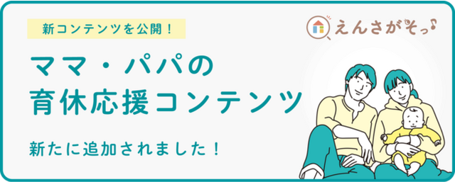 厚生労働省によると、令和3年度の男性の育児休業の取得率は13.97%となっており、まだまだ「パパの育休」が一般的になっているとは言えません。今回リリースした『ママ・パパの育休応援コンテンツ』では、男性の育休に関する制度の解説や、各家庭にあった育休の取得方法など様々なコラムを公開しています。『えんさがそっ♪』では、まずは”育休について知る”ところから保護者をサポートし、男性の育休取得を推進いたします。