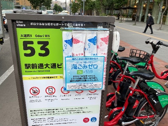 「CHANGE FOR THE BLUE in北海道実行委員会」は、環境にやさしい電動自転車のシェアを行っている「認定NPO法人 ポロクル」と共同で、7月26日~9月25日までの2か月間、札幌市内10か所のサイクルのポートに専用のごみ袋を収納したケースを設置する企画が好評の中、先日無事終了いたしました。