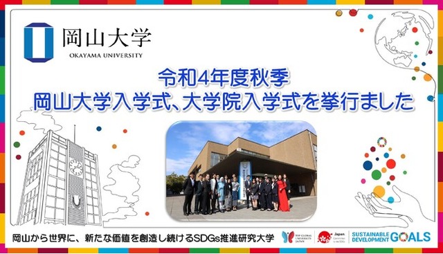 国立大学法人岡山大学(本部:岡山市北区、学長:槇野博史)は、2022年10月3日、秋季入学式を創立五十周年記念館で行い、新たに入学したグローバル・ディスカバリー・プログラム学生28人と大学院生130人が大学生活へのスタートを切りました。