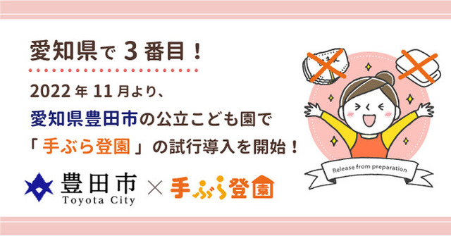BABY JOB株式会社(本社:大阪府大阪市、以下当社)は、愛知県豊田市の公立こども園において、当社とユニ・チャーム株式会社が提供する、保育施設向け紙おむつの定額サービス「手ぶら登園」の試行導入を、2022年11月より2か月間実施することをお知らせします。愛知県内では、豊橋市、半田市に続いて3番目となります。