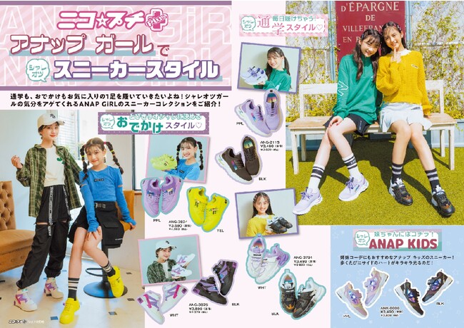 今回掲載されるアイテムは全5種類です。やわらかなニット素材で、ロゴやアウトソールパーツのレインボーがポイントのANG-2115や、着脱簡単な面ファスナー付きが忙しい朝にも助かるANG-3791は、通学用にぴったりなタイプです。また、まぶしいくらいのネオンイエローや鮮やかなパープルにオーロラ色に輝くタグ付きのANG-3824と、足元にボリュームで存在感をアップしてくれるクールなハイカットのANG-3825は、おでかけスタイルにおすすめです。「ニコ☆プチ+(プラス)」の誌面では、人気の専属モデルがおしゃれな女の子の気分がアガるスニーカーコーデで登場します。