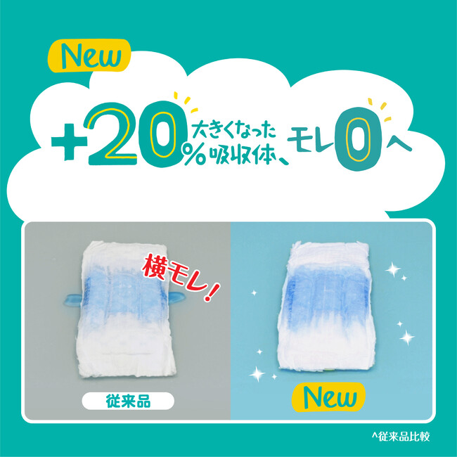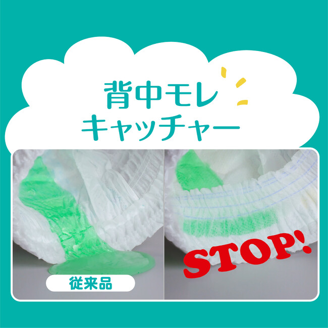 さらに、赤ちゃんの発達段階に合わせたモレ防止のニーズに対応するため、パンツMがはいはい用、たっち用の2タイプに分かれて登場します。ゆるうんちが多い赤ちゃんのために、パンツSサイズとMサイズはいはい用には、「背中モレキャッチャー」を採用。ポケットのような空間がゆるうんちをせき止め、背中からのモレをしっかりガードします。また、パンツS・Mサイズには従来品より20%大きくなった*1吸収体を新たに採用し、おしっこもゆるうんちの水分もさらに素早く吸収します。発達とともにおしっこやうんちの量が増えてきても、モレにくいので安心です。