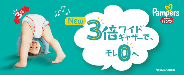 パンツタイプには、発達段階に合わせたモレ防止機能をサイズ別に採用。パンパースの研究や消費者調査から、はいはいや、よちよち歩きで動きが活発になった赤ちゃんは、足の付け根からの横モレが増えることがわかっています。そこで全サイズに、足まわりからの横モレをしっかりガードする「3倍ワイド*1ギャザー」を採用。従来品より3倍幅広くなったギャザーが足回りにぴったりフィットするので、赤ちゃんが様々な動きをしても横モレを防ぎます。